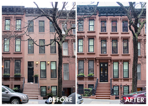 The Ziehl/Starr Residence, a three-story Neo-Grec brownstone in the Expanded Carnegie Hill Historic District, had undergone many alterations under its various owners throughout its 138-year history, including being covered in stucco. Each alteration stripped away original ornamentation, defining details, and a great part of the building’s historic character. After Amelia and Matthew purchased the building in 2013, they observed a nearby rowhouse on the block undergoing a facade restoration project and were inspired to restore their own home’s facade.